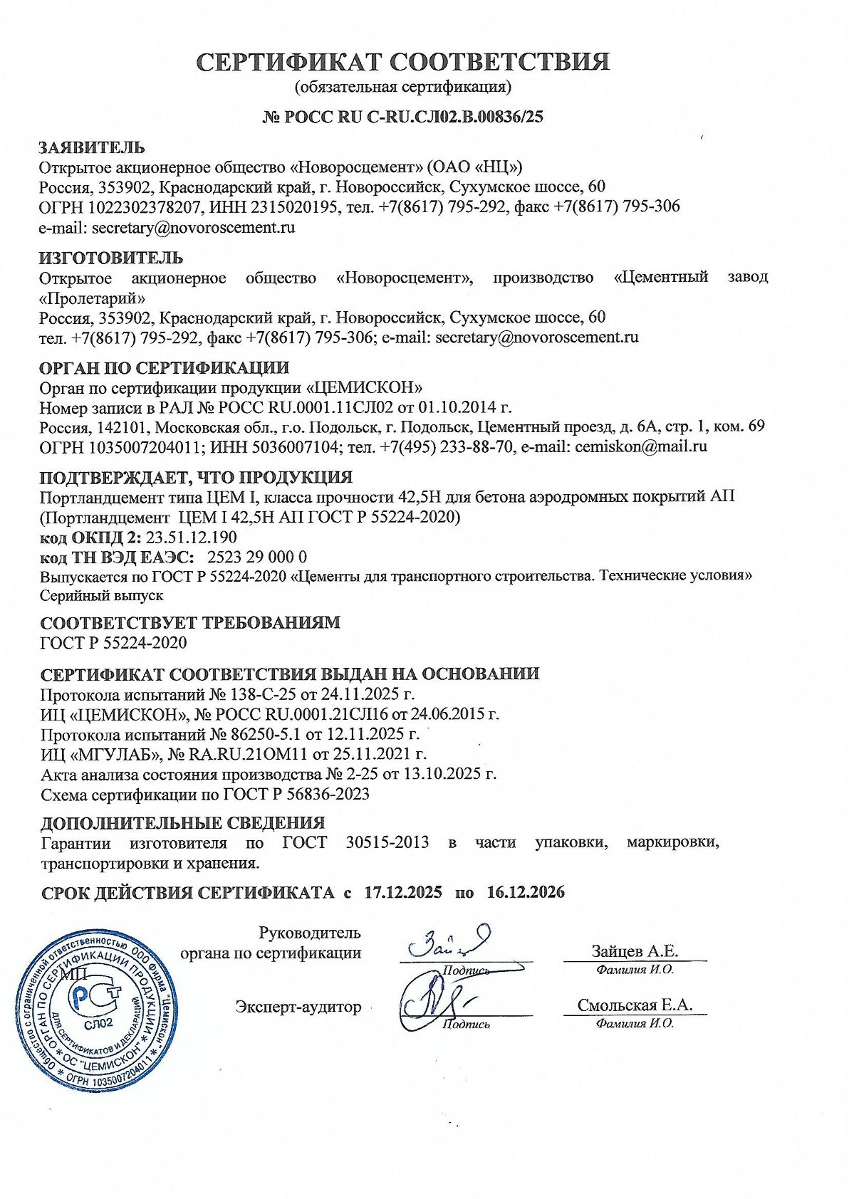 - нормируемого пониженного содержания алюминатов кальция и щелочных оксидов.