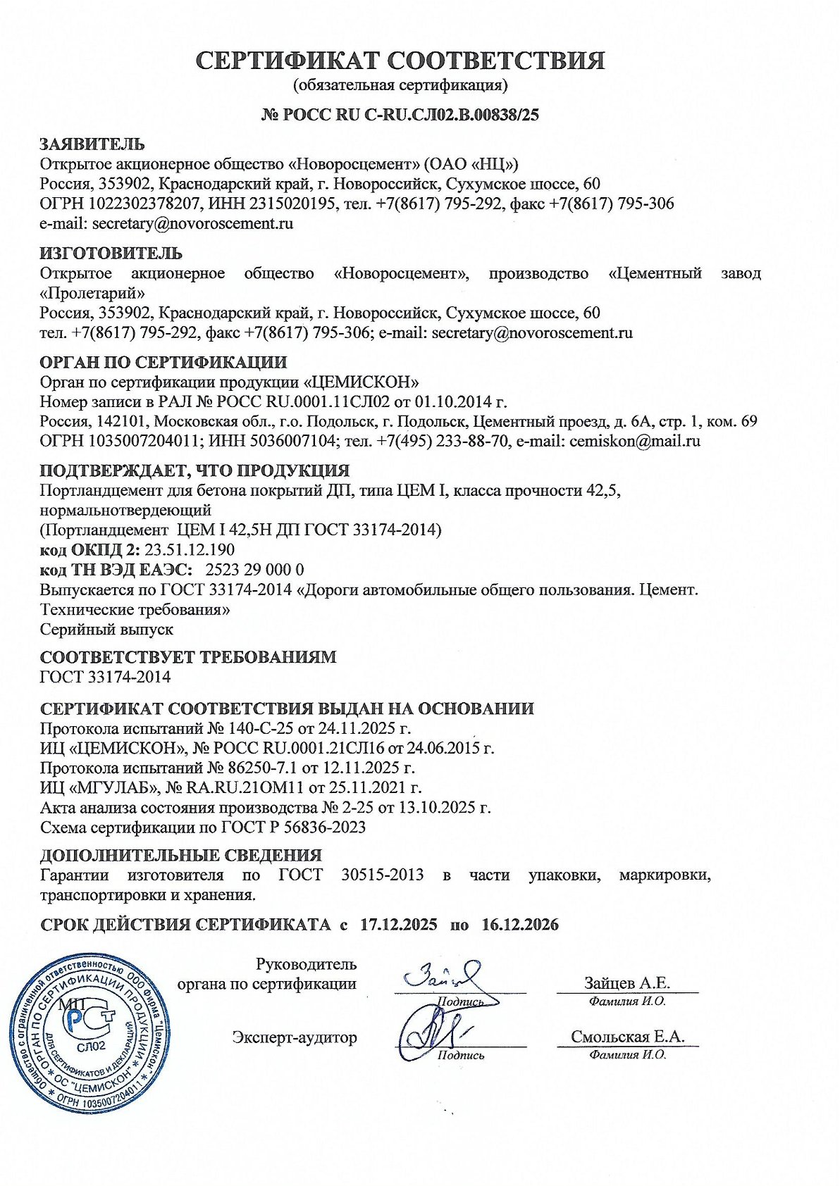 Основные особенности: средний темп твердения; высокая атмосферостойкость; высокая морозостойкость; средняя сульфатостойкость; низкие деформации усадки. Гарантийный срок соответствия цемента требованиям стандартов при соблюдении правил транспортировки и хранения — 60 суток с момента отгрузки.